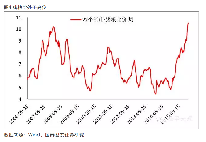 其次,豬價從15年3月開始上漲,基數(shù)逐漸升高,同比數(shù)據(jù)上升速度會下降。最后,受廠房規(guī)模限制和生豬成本價格比影響,壓欄時間最多在1-2個月。當(dāng)存在通脹預(yù)期時,養(yǎng)殖戶預(yù)期生豬價格可能上漲,邊際上會有更多的人愿意延遲出欄以獲得較高的利潤(“壓欄”)。那么市場上短期的生豬供應(yīng)量會相應(yīng)減少,從而導(dǎo)致生豬價格的上漲。但據(jù)了解,散戶容易出現(xiàn)壓欄行為,大型養(yǎng)殖場受廠房限制影響不容易出現(xiàn)壓欄行為;生豬出欄量高于230斤后,成本價格比將變得不劃算。
