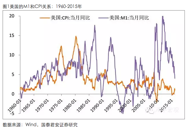 在美國,1980年以前M1對CPI的領(lǐng)先跡象比較明顯,但是近30年以來,二者的先行滯后關(guān)系很不顯著。1980年是美國經(jīng)濟(jì)結(jié)構(gòu)的重要轉(zhuǎn)折點,1980年美國經(jīng)濟(jì)完成了重化工的發(fā)展階段,向信息產(chǎn)業(yè)和服務(wù)業(yè)時代轉(zhuǎn)型,煤電油運(yùn)等傳統(tǒng)的瓶頸部門已經(jīng)不再構(gòu)成瓶頸約束,貨幣供應(yīng)不再直接通過瓶頸部門對實體經(jīng)濟(jì)產(chǎn)生直接影響,而主要通過大宗商品和虛擬經(jīng)濟(jì)產(chǎn)生間接影響,因此M1向?qū)嶓w經(jīng)濟(jì)和CPI的影響方式和傳導(dǎo)機(jī)制發(fā)生了根本性的改變。
