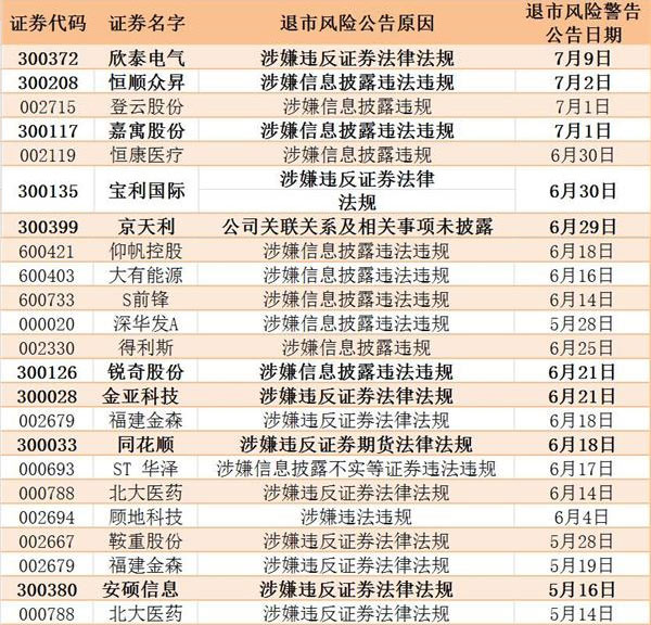 同花順因有非法經(jīng)營證券業(yè)務(wù)行為,而被證監(jiān)會立案調(diào)查,6月18日時(shí)仍在發(fā)布暫停上市的風(fēng)險(xiǎn)警示;銳奇股份則是“涉嫌信息披露違法違規(guī)”而被立案調(diào)查,最后一份風(fēng)險(xiǎn)警示發(fā)布于6月21日。此外,金亞科技由于公司及實(shí)際控制人涉嫌違反法律法規(guī)而被調(diào)查中,恒順眾昇、嘉寓股份和寶利國際也仍在等待證監(jiān)會的調(diào)查結(jié)果。