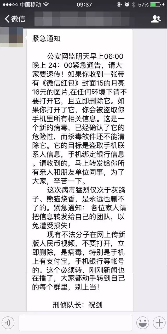 手機落入執(zhí)法部門手中,這對遵紀守法的普通人來說畢竟是一件小概率事件,人們更加恐懼的是那種中秋前夕在各個微信群中被不斷轉發(fā)的令人嚇破膽的“紅包有毒,病毒入侵手機盜取銀行信息”(已經被官方證明是謠言)。