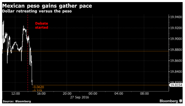辯論期間,被認(rèn)為辯論表現(xiàn)指標(biāo)的墨西哥比索匯率,有所上漲,期間漲幅一度達(dá)到1.4%,這表明市場人士認(rèn)為希拉里暫時(shí)處于領(lǐng)先趨勢。