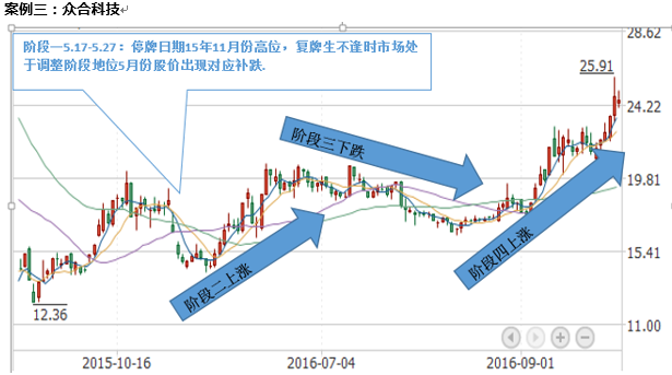 4.定增復(fù)牌出來處于市場震蕩階段,短期未有表現(xiàn),中期1-2個月走出震蕩上揚(績優(yōu)、公司不屬于小市值殼資源公司,所處行業(yè)景氣、有業(yè)績支撐)俗稱白馬/績優(yōu)定增,16年成功案例:4月份復(fù)牌的(凱樂科技、中天科技、亨通光電、聯(lián)創(chuàng)光電)