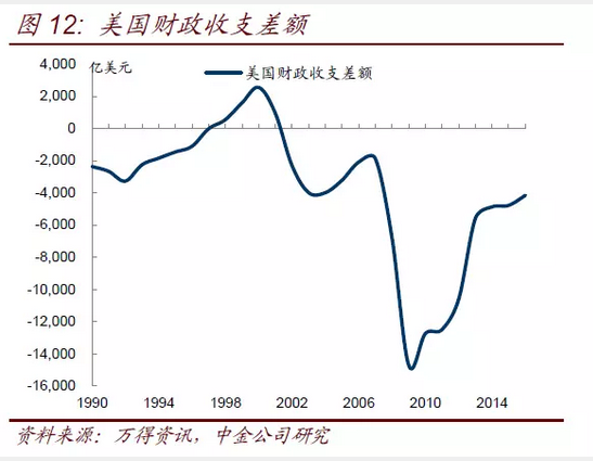 無論是減稅還是增加基建建設(shè),都是激進(jìn)型的財政政策,會相應(yīng)增加財政赤字和國債發(fā)行。最近幾年美國的財政赤字規(guī)模和赤字率有所下降(圖12),從次貸危機(jī)后的超過1萬億的赤字規(guī)模降至最近兩年的4000-5000億,背后得益于美國經(jīng)濟(jì)的逐步復(fù)蘇和居民收入的回升推動稅收增長。按照特朗普的減稅方案,暫不考慮支出端的變化,保守估計每年美國的財政收入會減少5000億美元甚至更多。這意味著美國的財政赤字可能要從目前4000-5000億美元水平回升到1萬億以上,對應(yīng)的赤字率從3%-4%的水平上升到8%-10%,甚至可能更高。