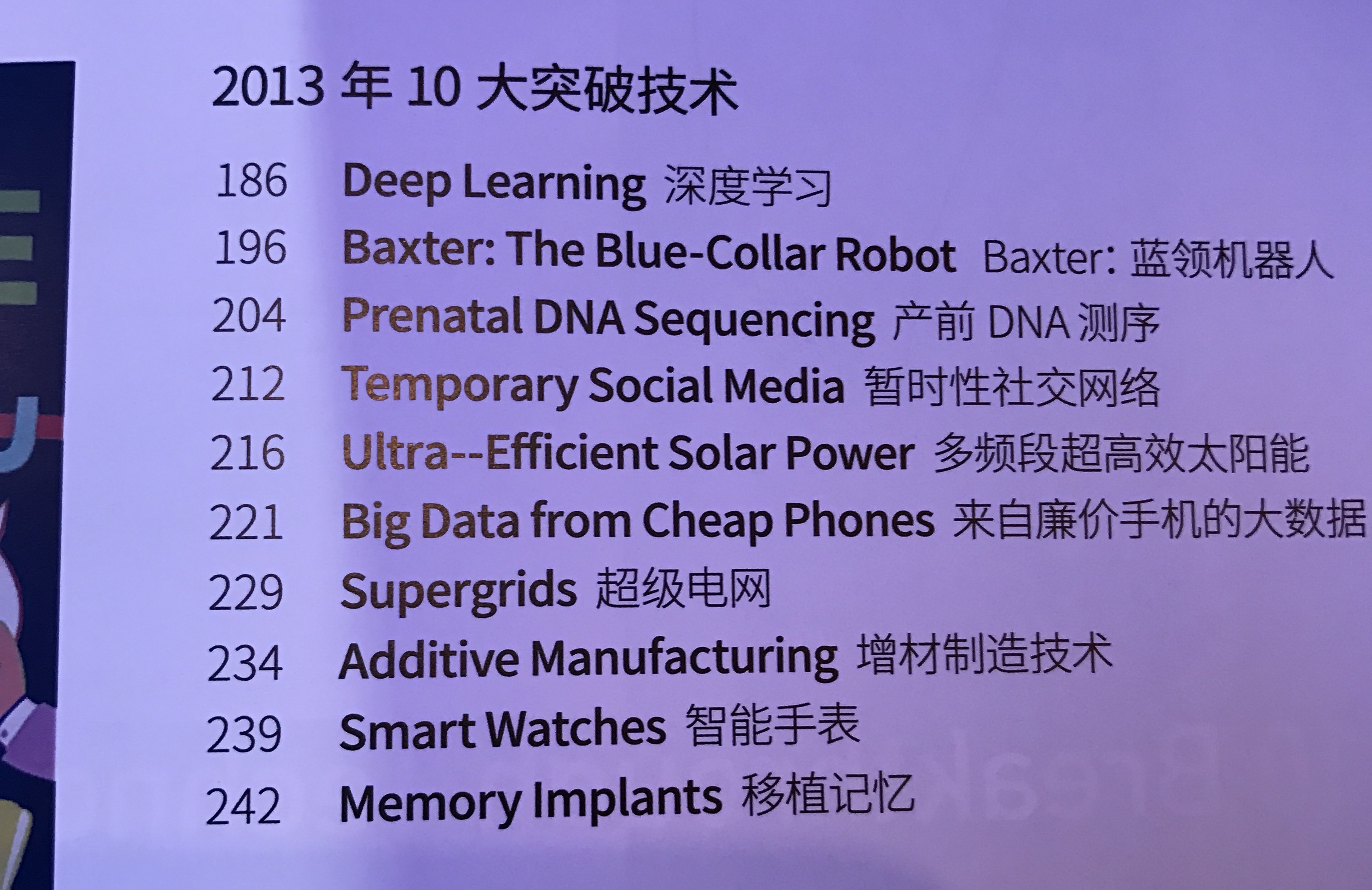2016年:(以下圖片拍自《麻省理工科技評論》出版的《科技之巔》一書,由中國工信出版集團和人民郵電出版社出版)