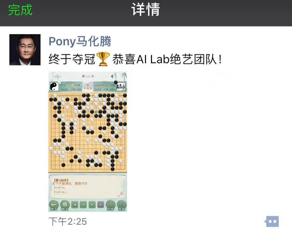騰訊的圍棋AI“絕藝”參加了在日本舉辦的第10屆UEC杯世界計算機(jī)圍棋大賽并奪得了冠軍,馬化騰也在朋友圈發(fā)電祝賀。