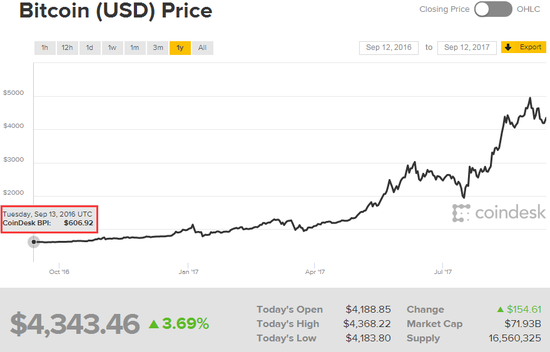 比特幣從去年今天的約600美元一枚,暴漲到當前的4,352.59美元一枚,漲幅高達725%。而年內(nèi)新高時其一度逼近5000美元一枚。最近中國監(jiān)管機構(gòu)對電子貨幣首發(fā)(ICO)的禁令給比特幣蒙上了陰影。
