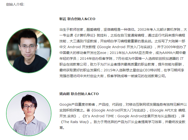 在極客學(xué)院的官網(wǎng)介紹上,目前只有聯(lián)合創(chuàng)始人&CEO靳巖和聯(lián)合創(chuàng)始人&CTO姚尚朗的介紹。其實(shí)在半年前,這里還有另外兩個(gè)聯(lián)合創(chuàng)始人的介紹,他們分別是營(yíng)銷(xiāo)負(fù)責(zé)人李杰,以及運(yùn)營(yíng)和HRD負(fù)責(zé)人王鑫。下面是當(dāng)年的介紹,而今這兩位聯(lián)合創(chuàng)始人的微博認(rèn)證資料都改為前極客學(xué)院聯(lián)合創(chuàng)始人。