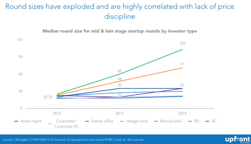 就在短短兩年間,共同基金投資交易周期中的中位數(shù)值已經(jīng)翻了兩倍多,對沖基金也存在同樣現(xiàn)象。也就是說,大量資金在科技創(chuàng)業(yè)公司融資末期的生態(tài)系統(tǒng)中翻騰攪動,這對于快速增長的科技型創(chuàng)業(yè)公司真的是個利好嗎?長遠(yuǎn)看來,其實不然。因為這些公司最終都會付出一定代價。要么最終一步步走向 IPO,要么被那些幾乎確定他們要上市的大公司收購。所以終究還得要回歸理性。