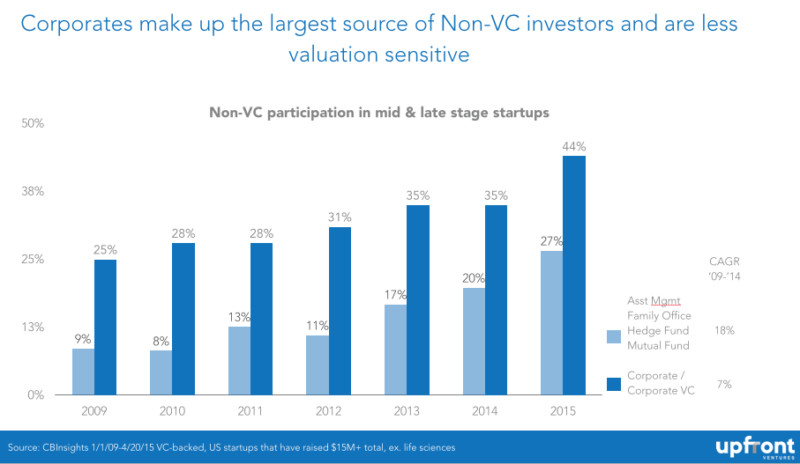當(dāng)你開始深挖次級獨角獸俱樂部成員猛增的幕后推手時,就能發(fā)現(xiàn)這些推波助瀾資本的一些來源。資本來源之一就是來自企業(yè)投資者,包括谷歌、樂天(日本最大的網(wǎng)絡(luò)零售商)、阿里巴巴、康卡斯特等。這些企業(yè)投資者增加了風(fēng)險投資的比例,但在利潤動機(jī)上與傳統(tǒng)投資者有顯著不同,企業(yè)投資者的風(fēng)投行為往往是出于定價動機(jī)。這并非是與企業(yè)投資者劃清界限,筆者只是強(qiáng)調(diào)出于戰(zhàn)略投資的考慮,企業(yè)投資者的投資行為往往會超出純粹的金融投資者的理解范圍。