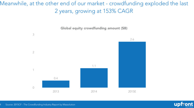 如果不承認(rèn)眾籌在創(chuàng)業(yè)公司中所扮演的重要角色,那就無法準(zhǔn)確地討論 2016 年風(fēng)險投資行業(yè)的愿景及展望。在過往的兩年中,我們看到有大量的科技創(chuàng)業(yè)公司通過眾籌平臺獲得資金。同樣在過往的兩年中,眾多新興眾籌平臺如雨后春筍般在全球各地涌現(xiàn),眾籌的金額也水漲船高,從兩年前的 4 億美元暴漲至 26 億美元。