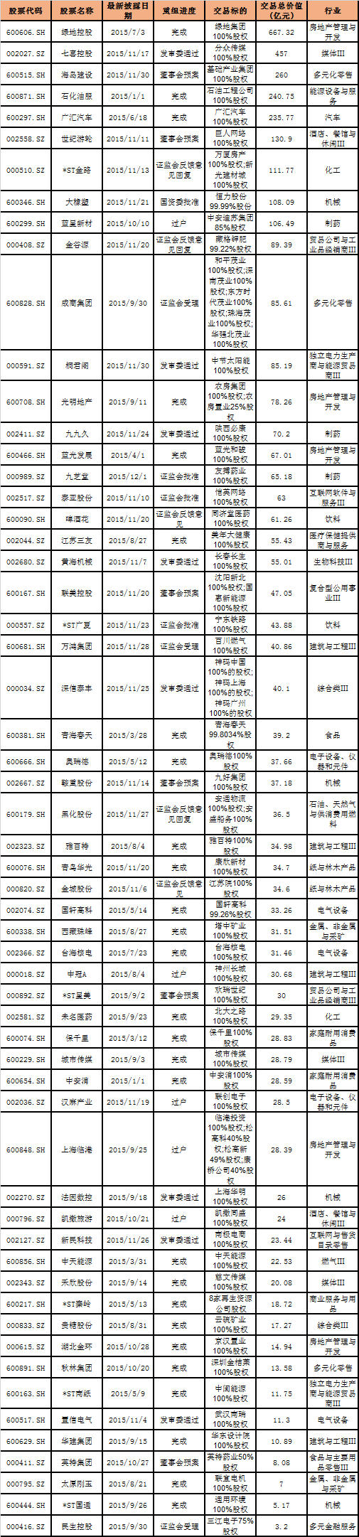 綠地集團(tuán)是今年A股最大借殼上市的成功案例。綠地集團(tuán)是中國最大的混合所有制房企,2014年金豐投資公布的相關(guān)重組方案,擬通過資產(chǎn)置換和發(fā)行股份購買資產(chǎn)方式重組,注入綠地集團(tuán)100%股權(quán),交易總價(jià)為667.32億元。今年7月份,金豐投資披露完成重大資產(chǎn)重組,同時(shí)正式將公司名稱變更為“綠地控股股份有限公司”。變更登記完成后,綠地控股成為綠地集團(tuán)的惟一股東,綠地集團(tuán)成為旗下全資子公司。