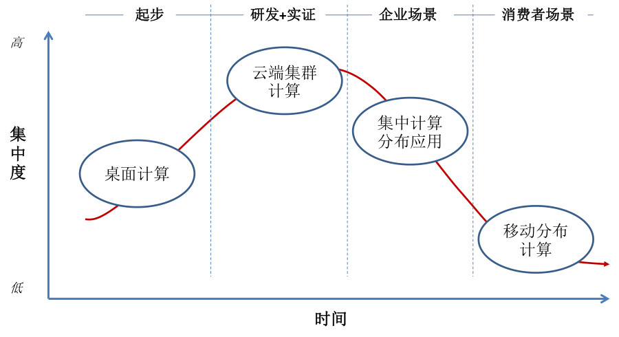 第一階段:實(shí)驗(yàn)室研究階段,這一階段的人工智能資源高度集中。?人工智能在 2011 年前的發(fā)展大致還處于實(shí)證研究階段,資源高度集中在國家或大學(xué)資助的研究機(jī)構(gòu)中,用于算法模型的訓(xùn)練和研究,人工智能還只能為極少數(shù)人接觸到。?這一階段大量的工作除了在算法模型本身的研究外,還包括建立計(jì)算能力本身。