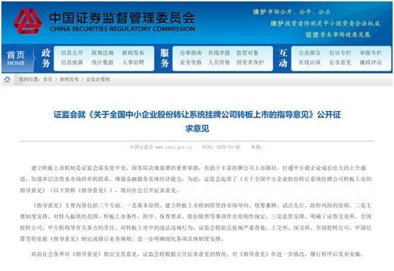 3月6日晚間,證監(jiān)會發(fā)布了《轉(zhuǎn)板上市指導(dǎo)意見(征求意見稿)》(簡稱“指導(dǎo)意見”),明確了新三板掛牌公司轉(zhuǎn)板到滬深交易所上市的制度安排,其中對轉(zhuǎn)入板塊的范圍、轉(zhuǎn)板上市條件、程序、保薦要求、股份限售等事項作出原則性規(guī)定。