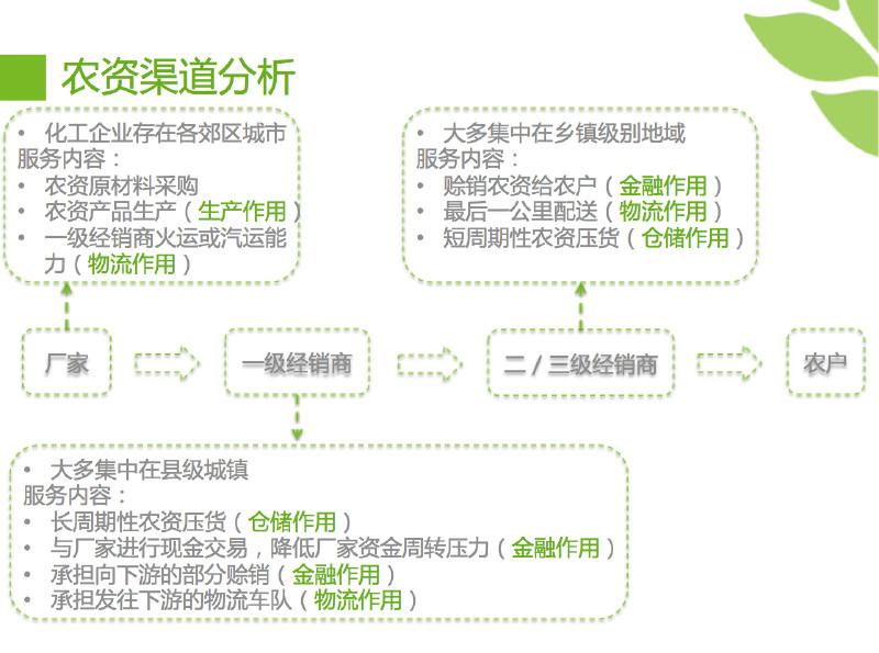 在當(dāng)前農(nóng)資行業(yè)里面,基本存在兩到三級(jí)的流通渠道,有些偏遠(yuǎn)地域存在四級(jí)的流通渠道,每個(gè)級(jí)別的渠道均承擔(dān)了相應(yīng)的服務(wù)內(nèi)容,才得以存在目前的市場(chǎng)環(huán)節(jié)中。