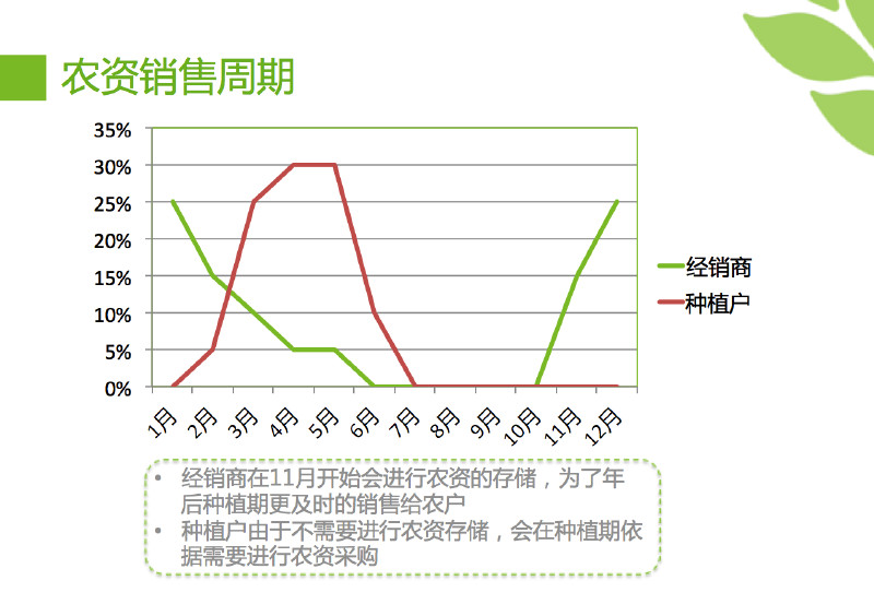 經(jīng)銷商為了及時(shí)的,更好的給種植戶提供農(nóng)資,會(huì)在年前進(jìn)行農(nóng)資存儲(chǔ),主要的存儲(chǔ)時(shí)期是 10 月到第二年的 2 月左右,這幾個(gè)月是各個(gè)經(jīng)銷商進(jìn)行大量存儲(chǔ)農(nóng)資的時(shí)期,同樣也是農(nóng)資生產(chǎn)企業(yè)的主要銷售周期。隨著種植期的不斷推進(jìn),經(jīng)銷商的庫(kù)存不斷被消化,進(jìn)而完成了本地農(nóng)資倉(cāng)儲(chǔ)的銷售工作。