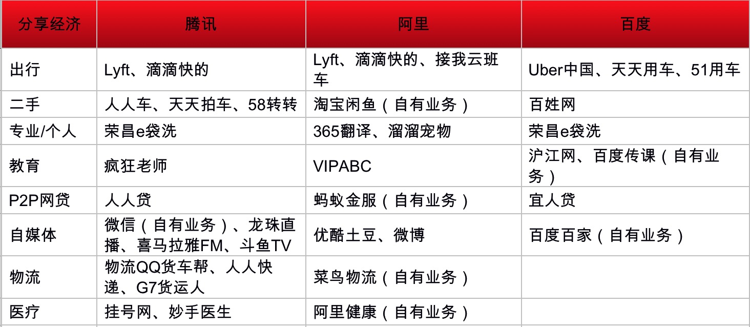 據(jù)不完全統(tǒng)計,BAT在分享經(jīng)濟領域,關注比較多的行業(yè)是出行分享,對于二手交易、專業(yè)/個人服務、教育、P2P網(wǎng)貸、自媒體和眾包物流均有所布局。