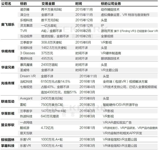 • 小米 :建小米探索實(shí)驗(yàn)室,初期重點(diǎn)投入包含VR方向;與迅雷一起參與樂相B輪的1.8億元融資。